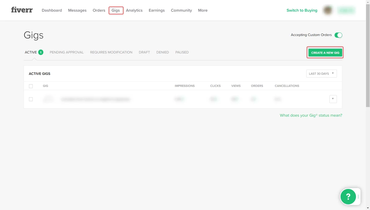 画面上部のメニューからGigsをクリックしてGigsのページヘ行き、[CREATE A NEW GIG]をクリックします。